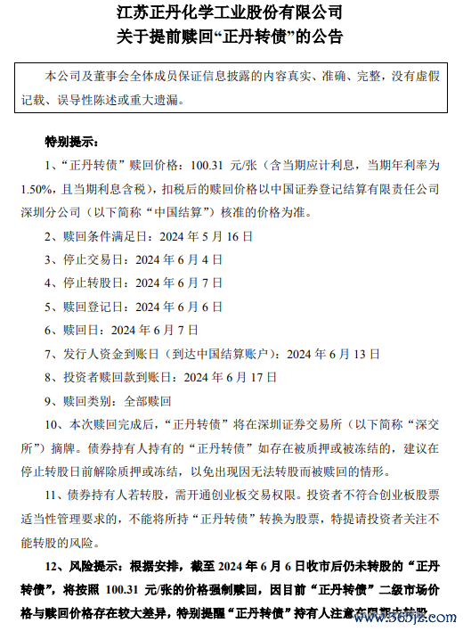 5月16日,正丹股份公告,自2024年4月16日至2024年5月16日,公司股票价格已有15个交易日的收盘价格不低于“正丹转债”当期转股价格(7.4元/股)的130%(即9.62元/股),已触发《募集说明书》中的有条件赎回条款。结合当前市场及公司自身情况,经过综合考虑,董事会同意公司行使“正丹转债”的提前赎回权利,赎回价格100.31元/张;“正丹转债”自2024年6月4日起停止交易,自2024年6月7日起停止转股。